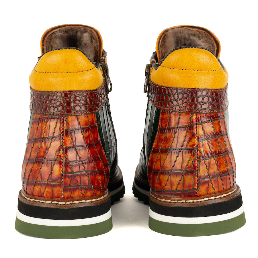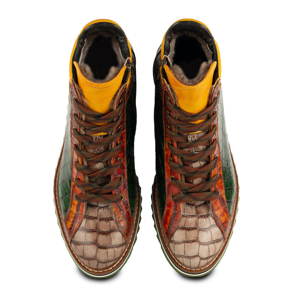 Materiale esterno: VITELLO STAMPATO COCCOROCCIA IN PUNTA, VITELLO STAMPATO COCCO CUOIO E VERDE LATERALMENTE, DIPINTE A MANO